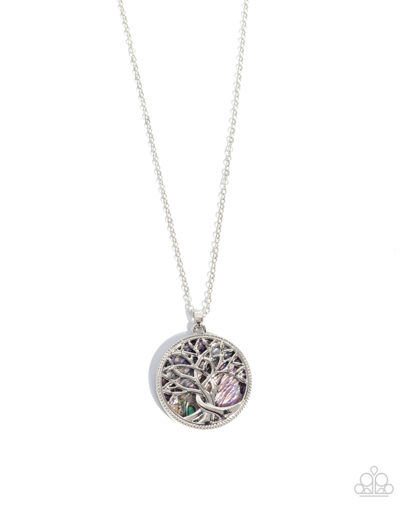 Gliding along a classic silver chain, a highly intricate silver tree blooms in front of an abalone shell backdrop for a whimsically wondrous pendant below the neckline. Features an adjustable clasp closure.