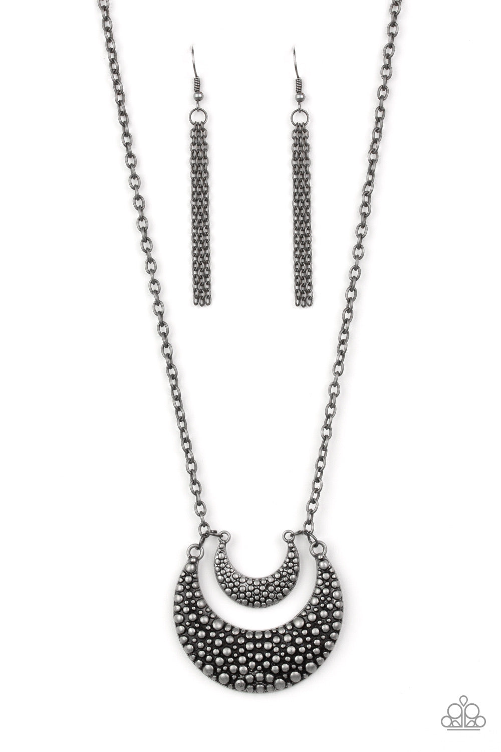 Featuring antiqued pebble-like textures, a smaller silver crescent frame swings above a larger silver crescent below the collar for an edgy stacked look. Features an adjustable clasp closure.