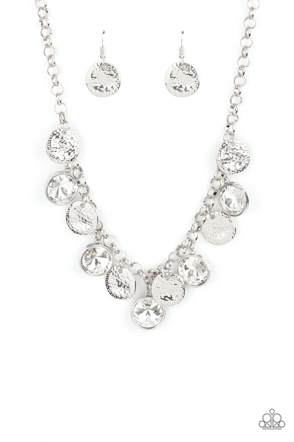 A blinding collection of hammered silver discs and oversized white gems swing from the bottom of a bold silver chain, creating noise-making sparkle below the collar. Features an adjustable clasp closure.