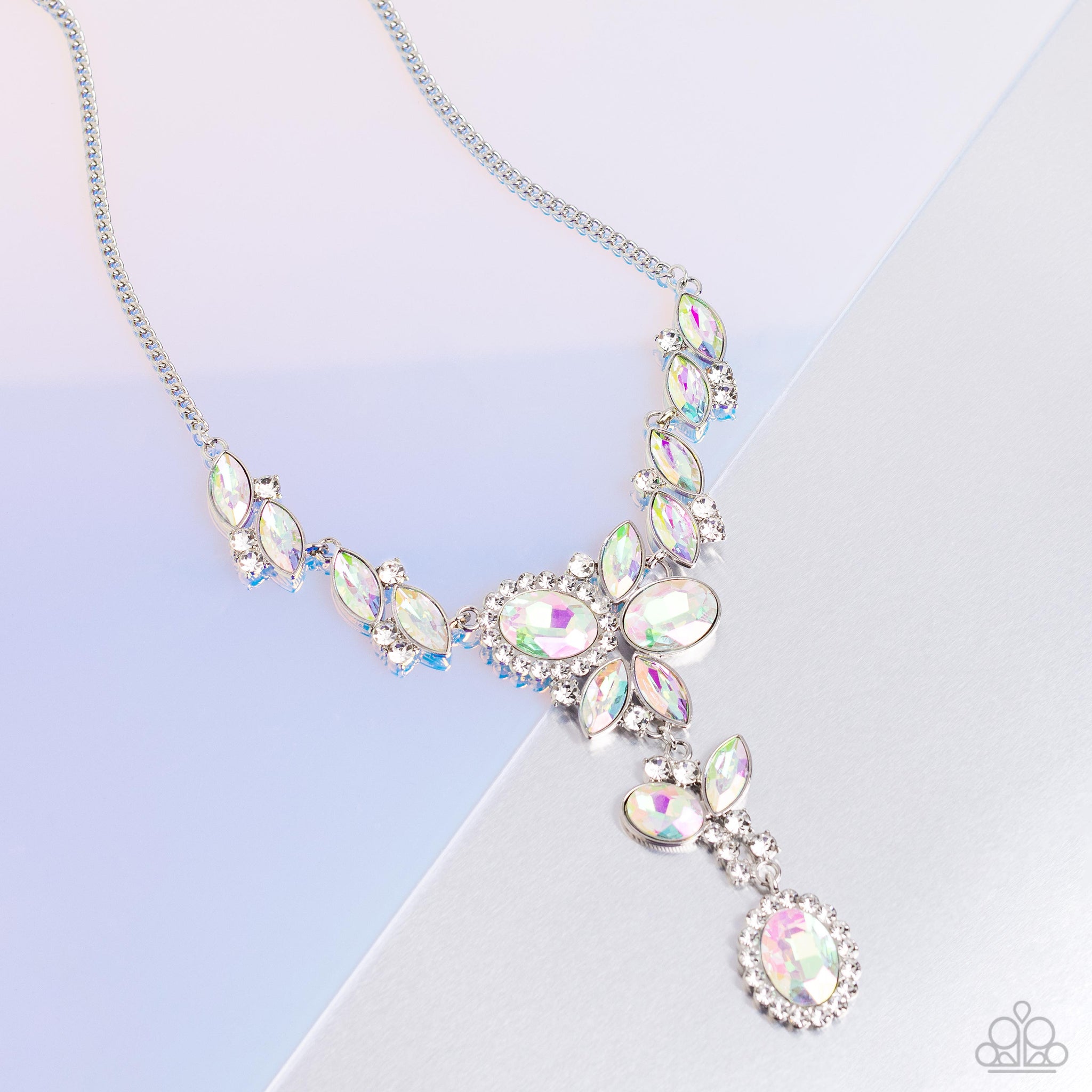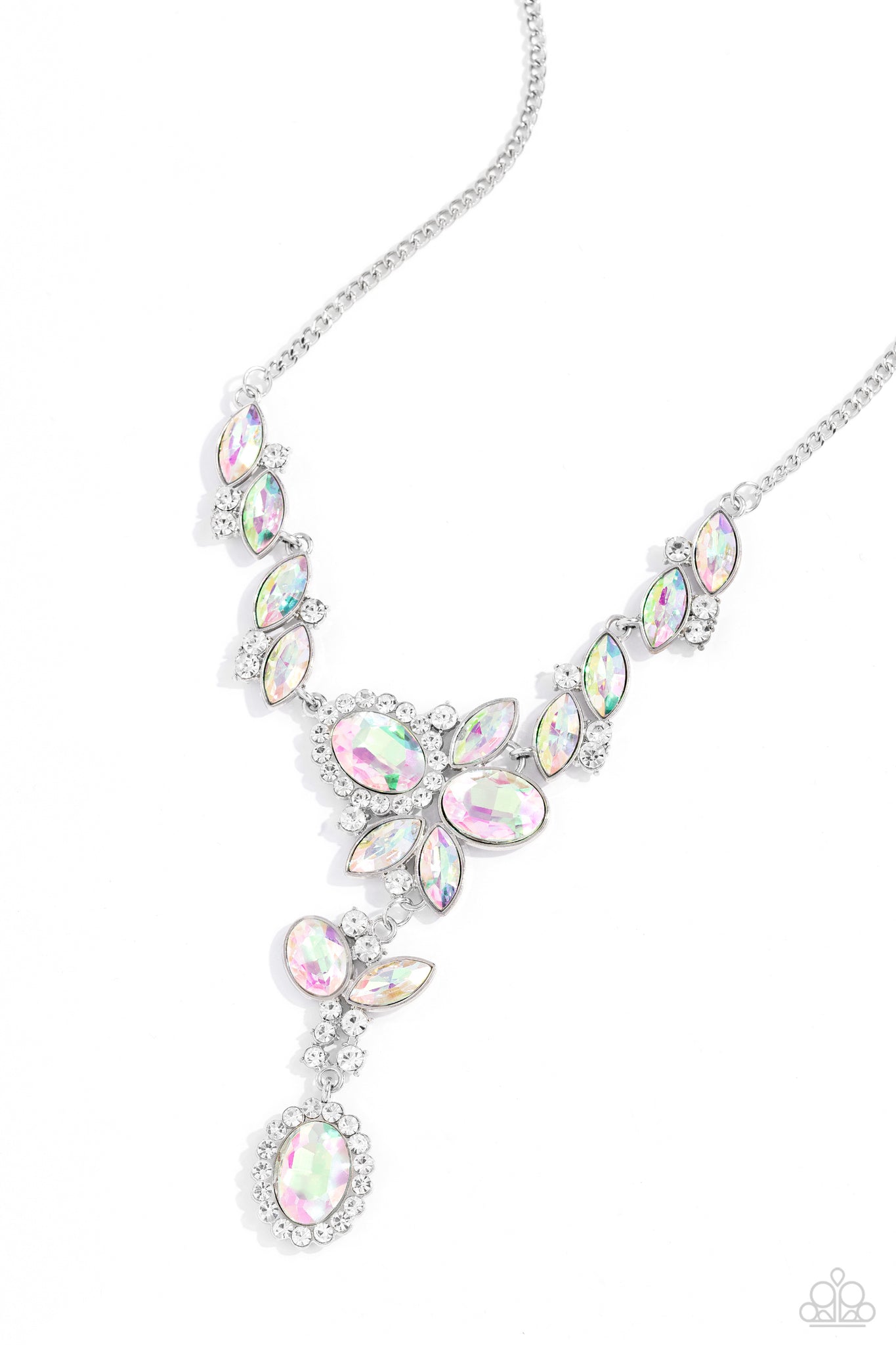 Featuring an iridescent shimmer, an unexpected explosion of oversized oval and marquise-cut gems cluster into haphazard groupings. Silver-pronged white rhinestones sporadically dot across the abstract canvas and encircle a few iridescent ovals for additional shimmer. The blinding clusters link together, creating a soft statement piece that cascades below the collar. Features an adjustable clasp closure. Due to its prismatic palette, color may vary.