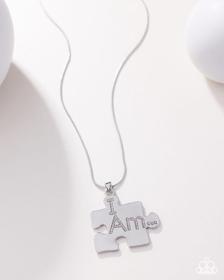 Gliding along a silver snake chain, a glistening silver puzzle piece is completely embellished on one side in white rhinestones, while the other side features the phrase "I Am..." outlined in additional white rhinestones for a polished, picture-perfect display.