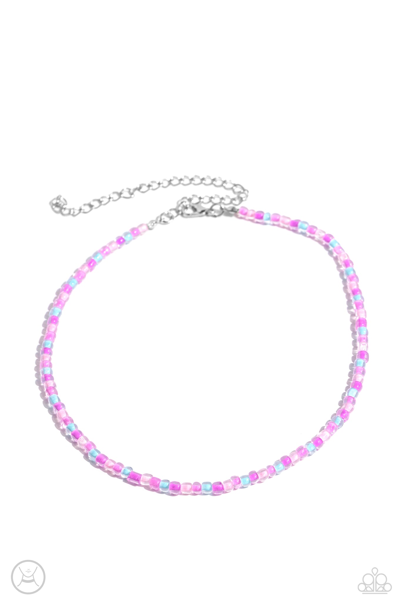 Stretched along an invisible wire, a collection of glassy Rose Violet, light blue, lavender, and baby pink beads circles above the collar for a vibrant pop of color. Features an adjustable clasp closure.