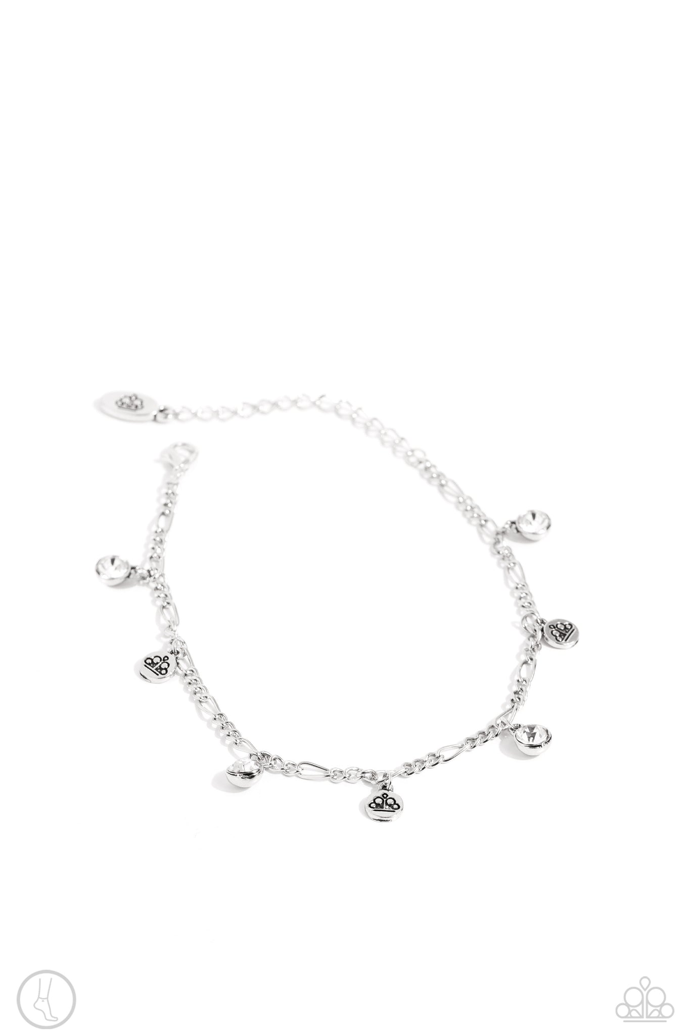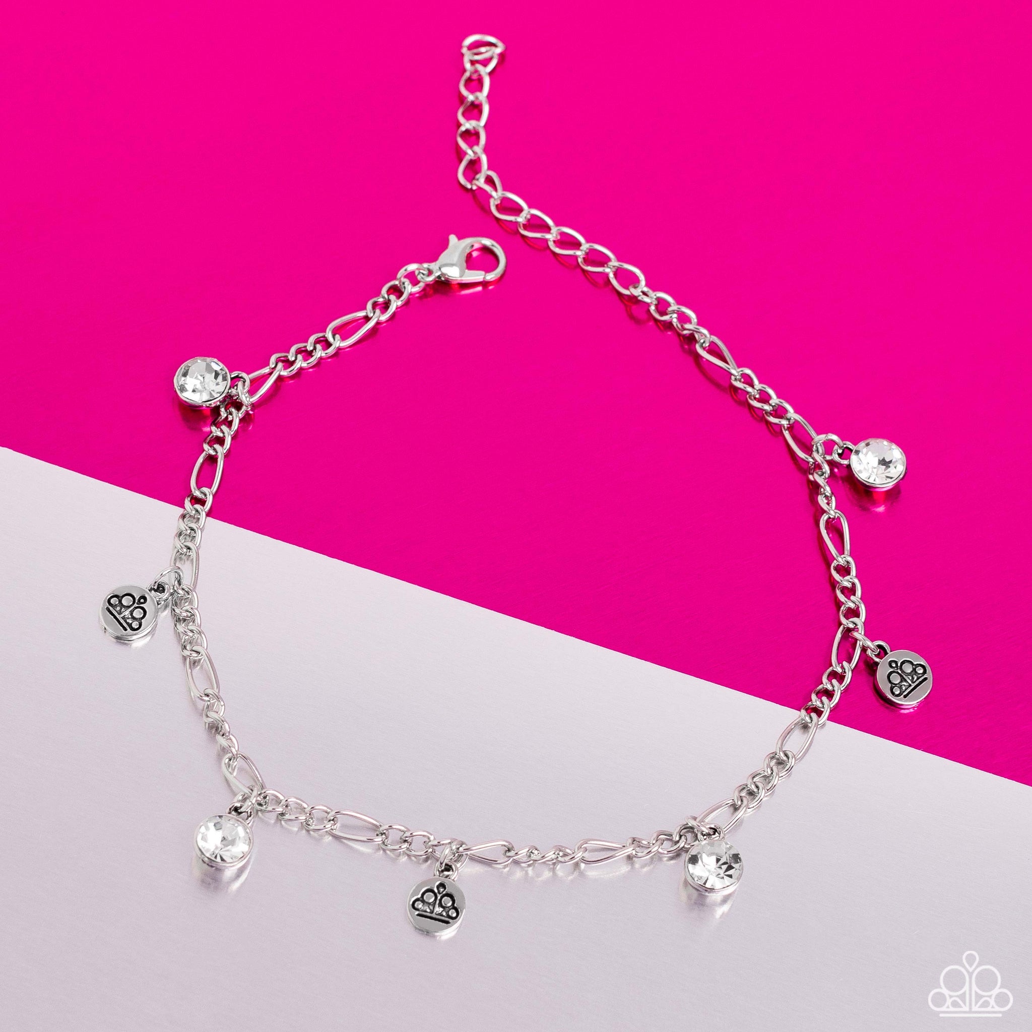 Dancing along a silver chain, white gems pressed in elevated silver frames, and Paparazzi-branded silver crown discs alternate around the ankle for a pop of fashionable fun. Features an adjustable clasp closure.