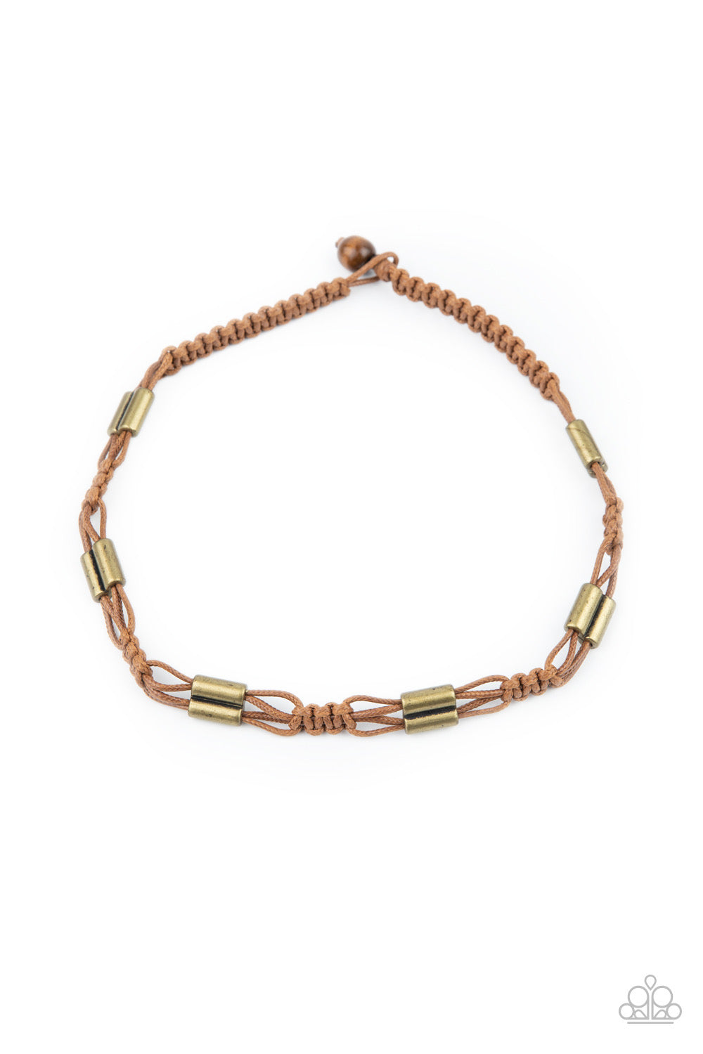 Bold brass accents are knotted in place along tan cording that decoratively braids around the neck for a rustic flair. Features an adjustable sliding knot closure.