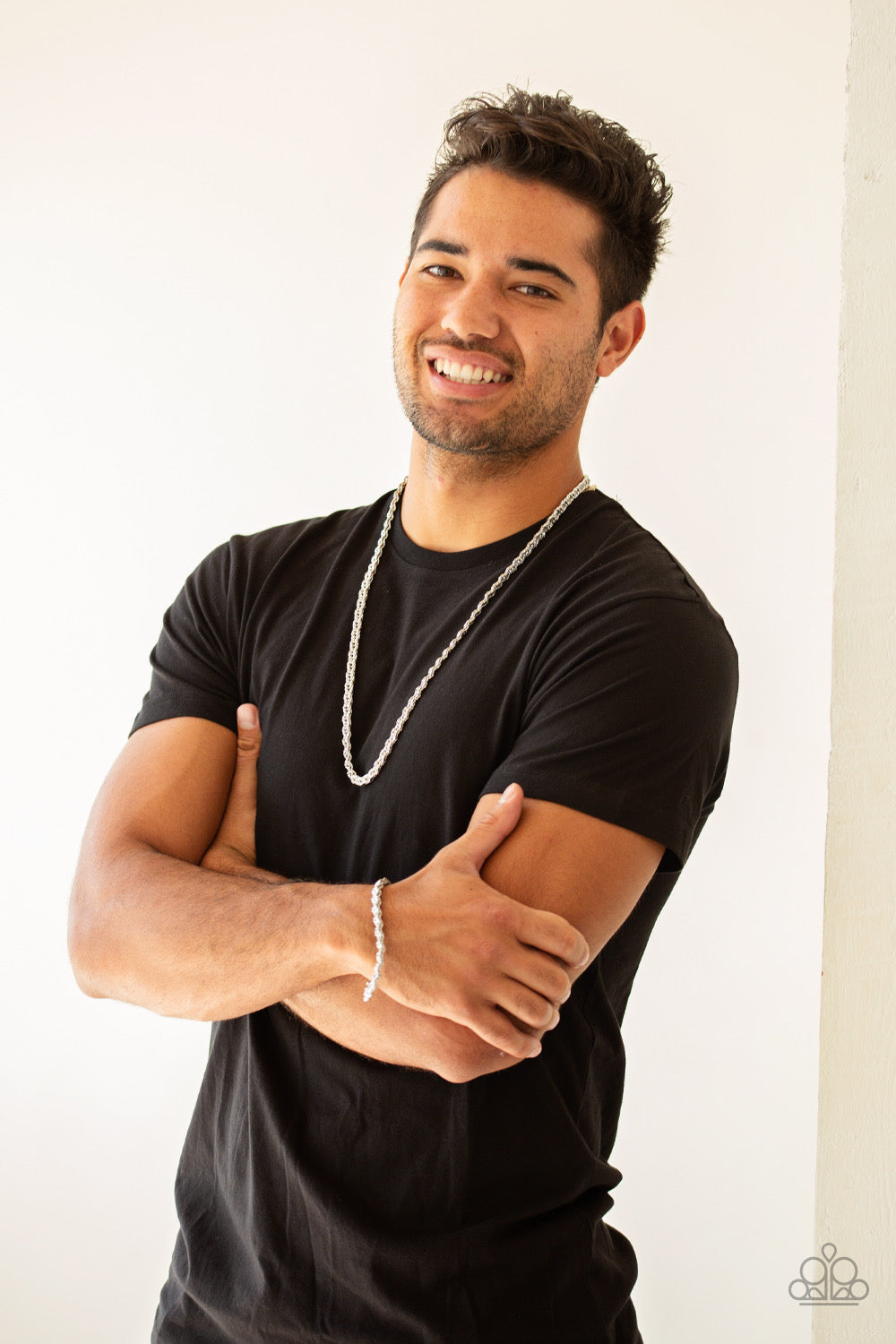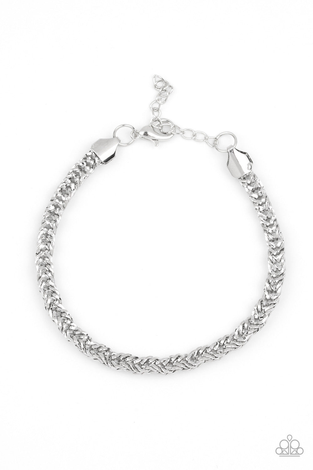Brushed in a high-sheen finish, an ornate silver chain links around the wrist for a bold look. Features an adjustable clasp closure.