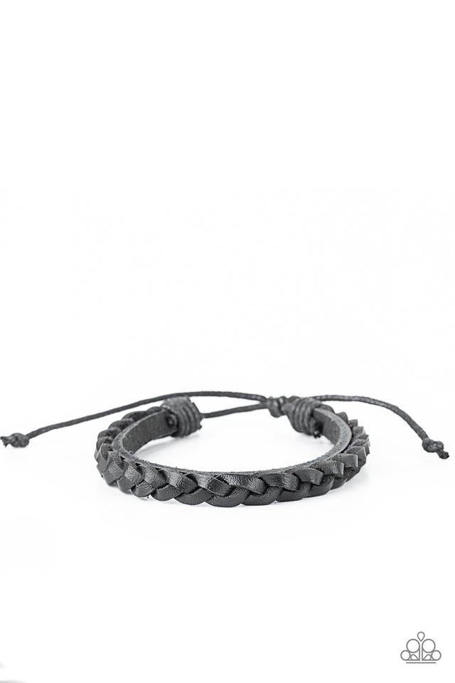 Strands of black leather cording braid across the front of a dainty black leather band, creating a rustic display around the wrist. Features an adjustable sliding knot closure.