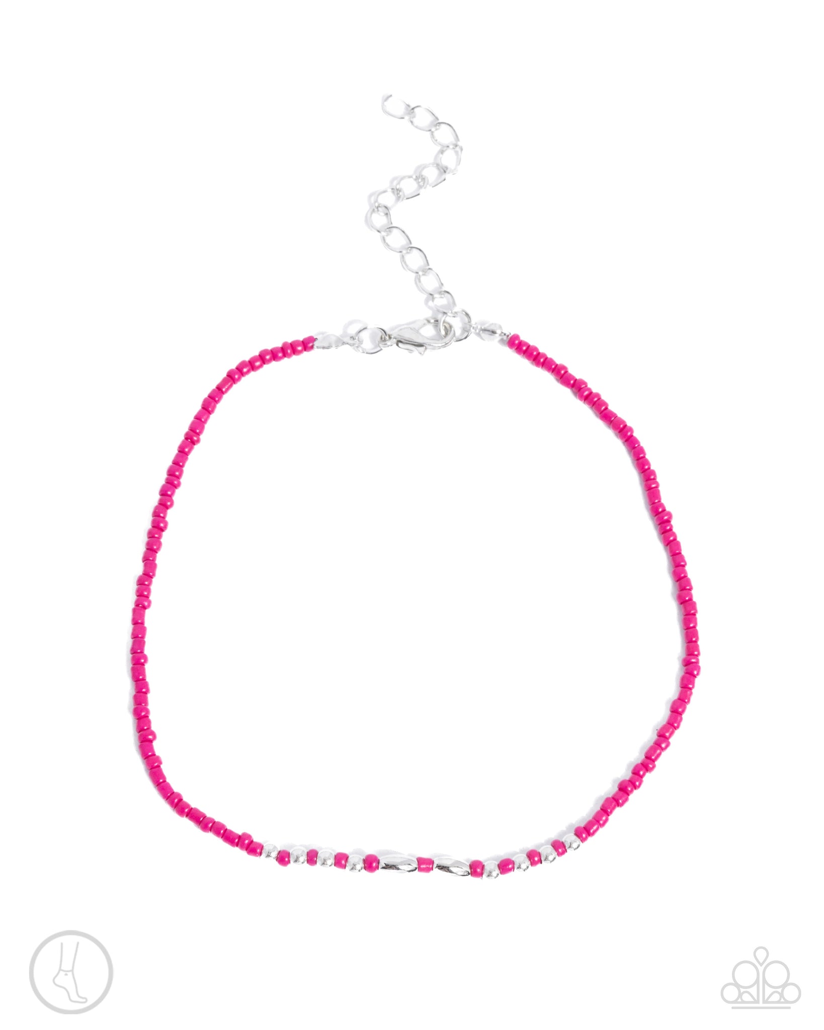 Infused along an invisible string, a collection of fuchsia seed beads, silver beads, and silver oval beads wrap around the ankle for a vibrant pop of color. Features an adjustable clasp closure.
