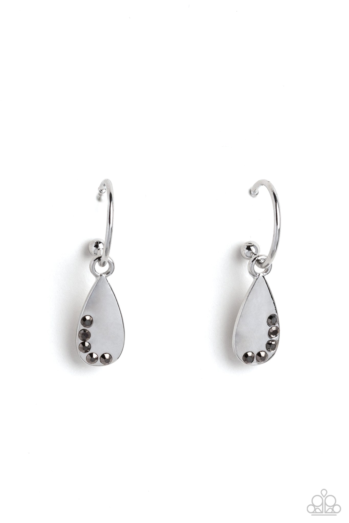 A small, skinny, silver hoop curves around the ear in a timeless fashion with a silver ball affixed to the end of the hoop, reminiscent of a barbell fitting. A silver metallic teardrop encrusted with glittery hematite rhinestones dangles from the skinny hoop for an edgy, shimmery statement. Earring attaches to a standard post fitting. Hoop measures approximately 1/2" in diameter.