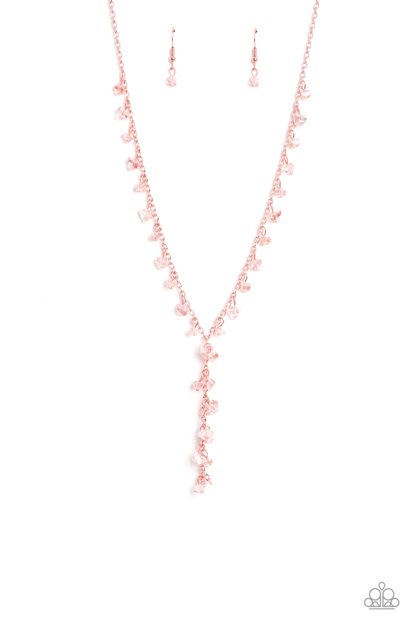 Infused along a shiny copper chain, chiseled pieces of white, reflective gems swing down the neckline, creating a timeless, lariat-like fringe. Features an adjustable clasp closure.