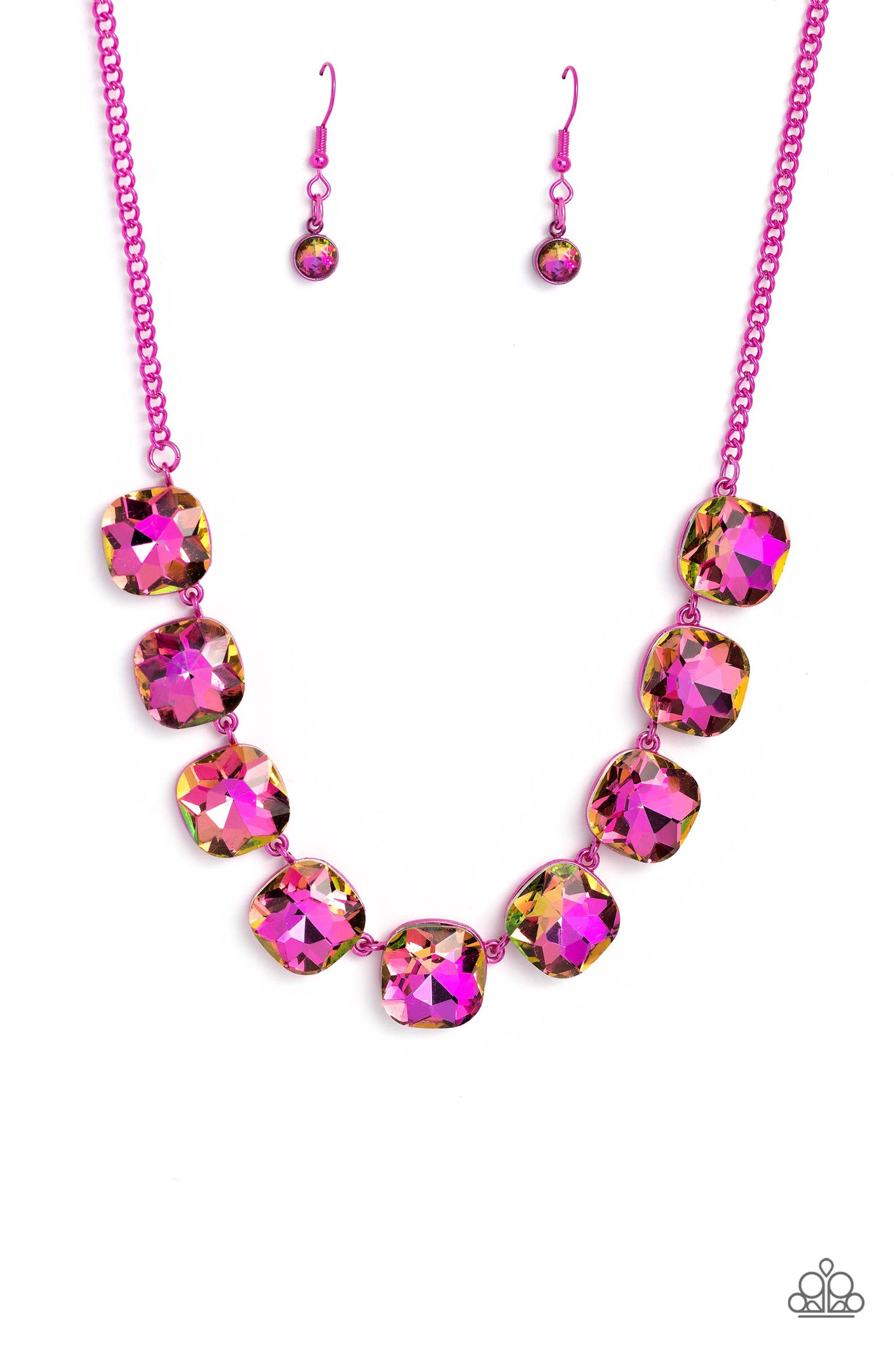 Featuring a vivacious pink chain, a collection of pink UV shimmery cushion-cut gems, pressed in vibrant pink frames, coalesces around the collar to create a playful pop of color. Features an adjustable clasp closure.