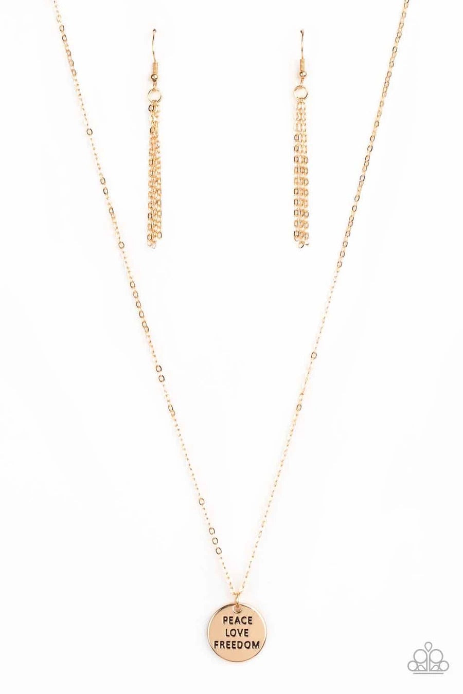 Stamped in the words, "Peace," "Love," and "Freedom," a shiny gold disc slides along a dainty silver chain below the collar for a patriotic inspired fashion. Features an adjustable clasp closure.