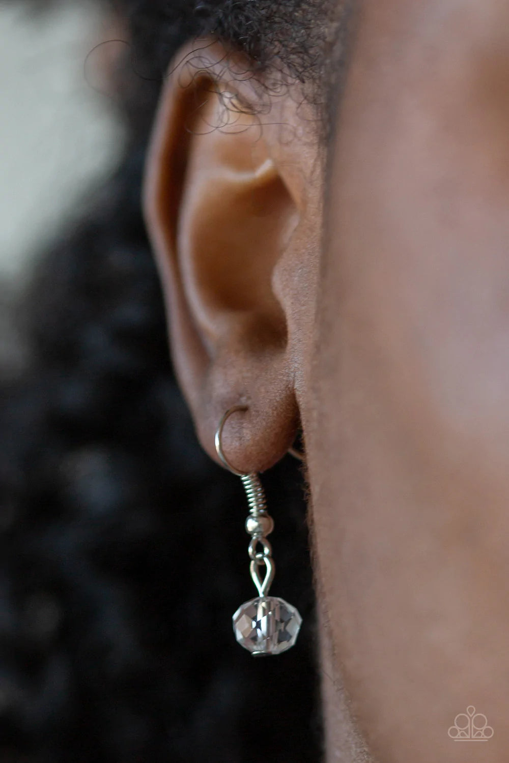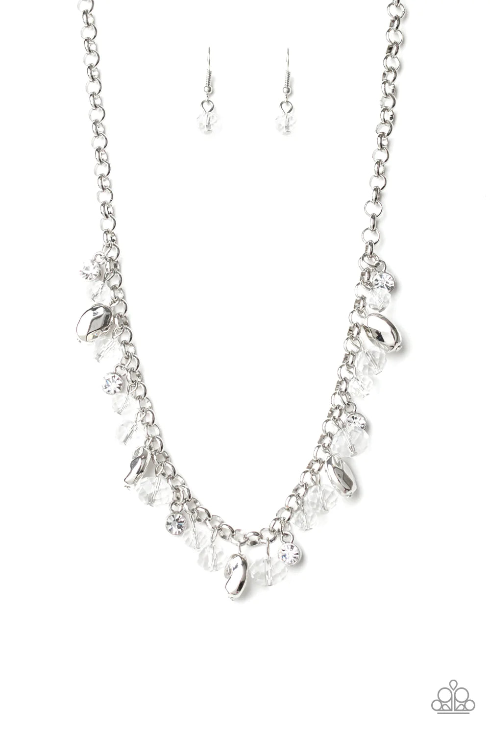 A glittery collection of sparking white rhinestones, faceted silver beads, and glassy crystal-like beads dangle from a shimmery silver chain, creating a refined fringe below the collar. Features an adjustable clasp closure.
