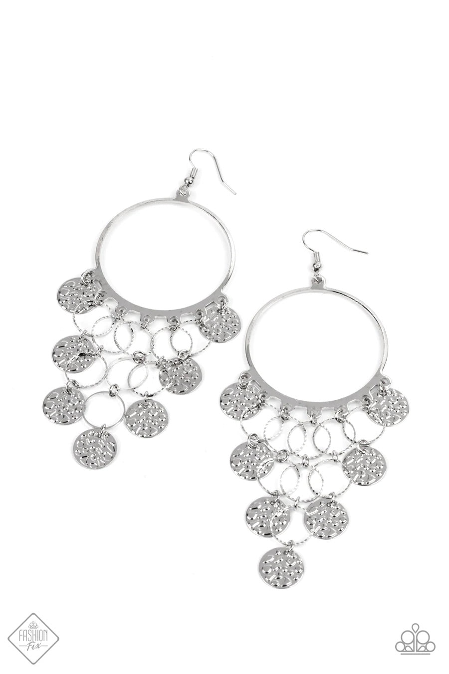 Tapered rows of interlocking hammered silver discs and dainty textured silver hoops cascade from the bottom of an airy silver hoop, creating a chime-like fringe. Earring attaches to a standard fishhook fitting.