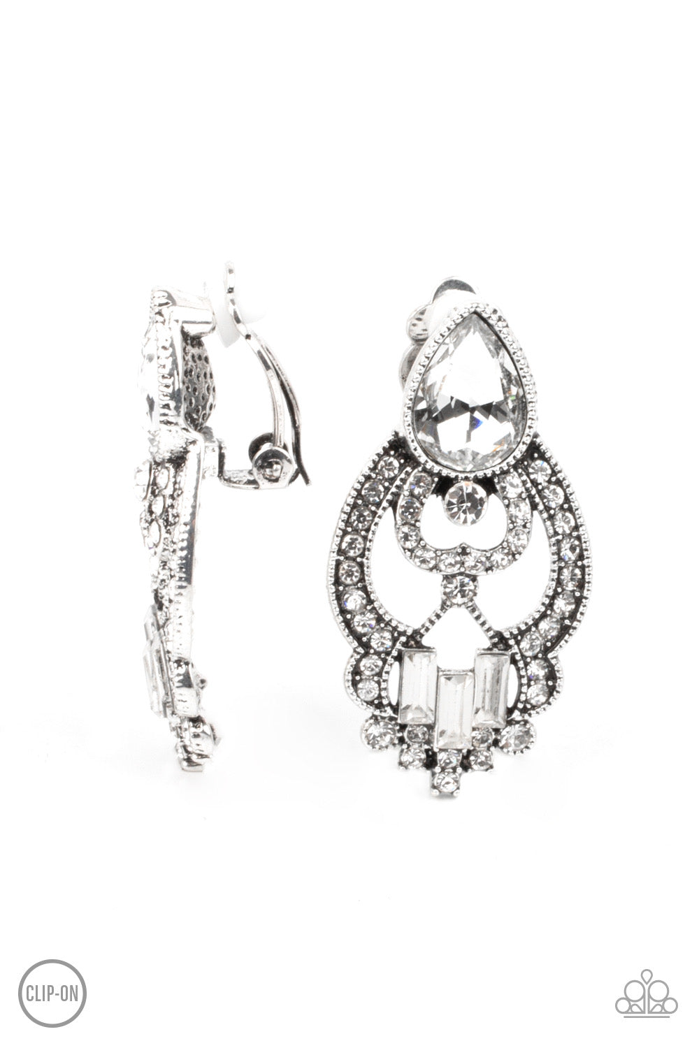 An oversized white teardrop gem and dainty row of white emerald cut rhinestones adorn a regal white rhinestone encrusted frame, creating a royal statement piece. Earring attaches to a standard clip-on fitting.
