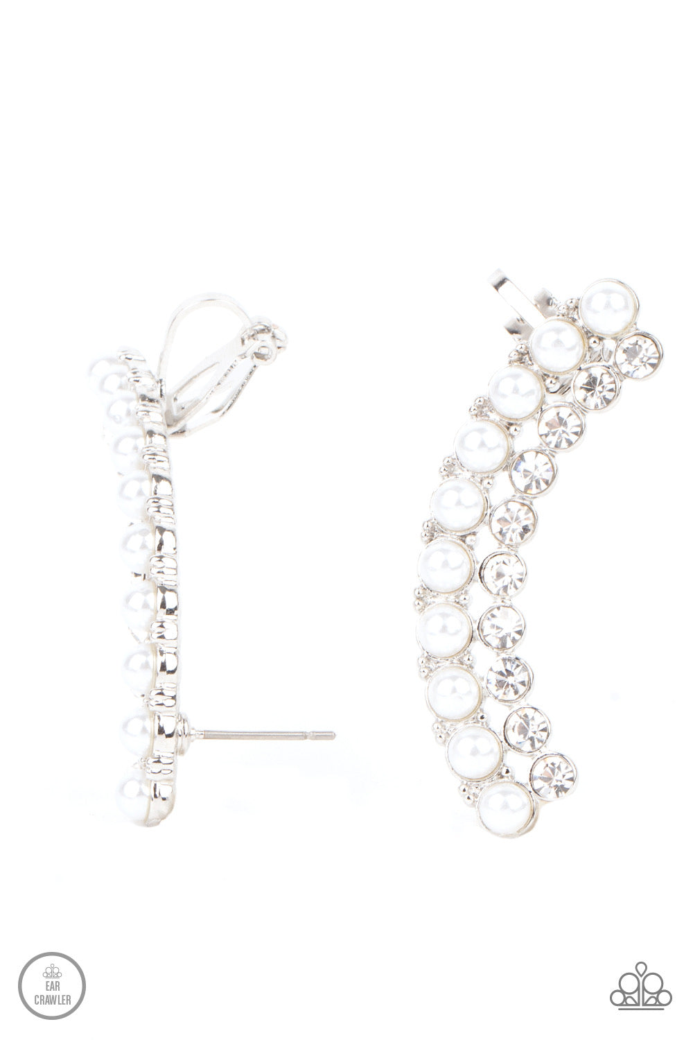 Featuring classic silver fittings, two rows of dainty white pearls and glassy white rhinestones arch into a timeless statement piece. Earring attaches to a standard post earring. Features a clip-on fitting at the top for a secure fit.