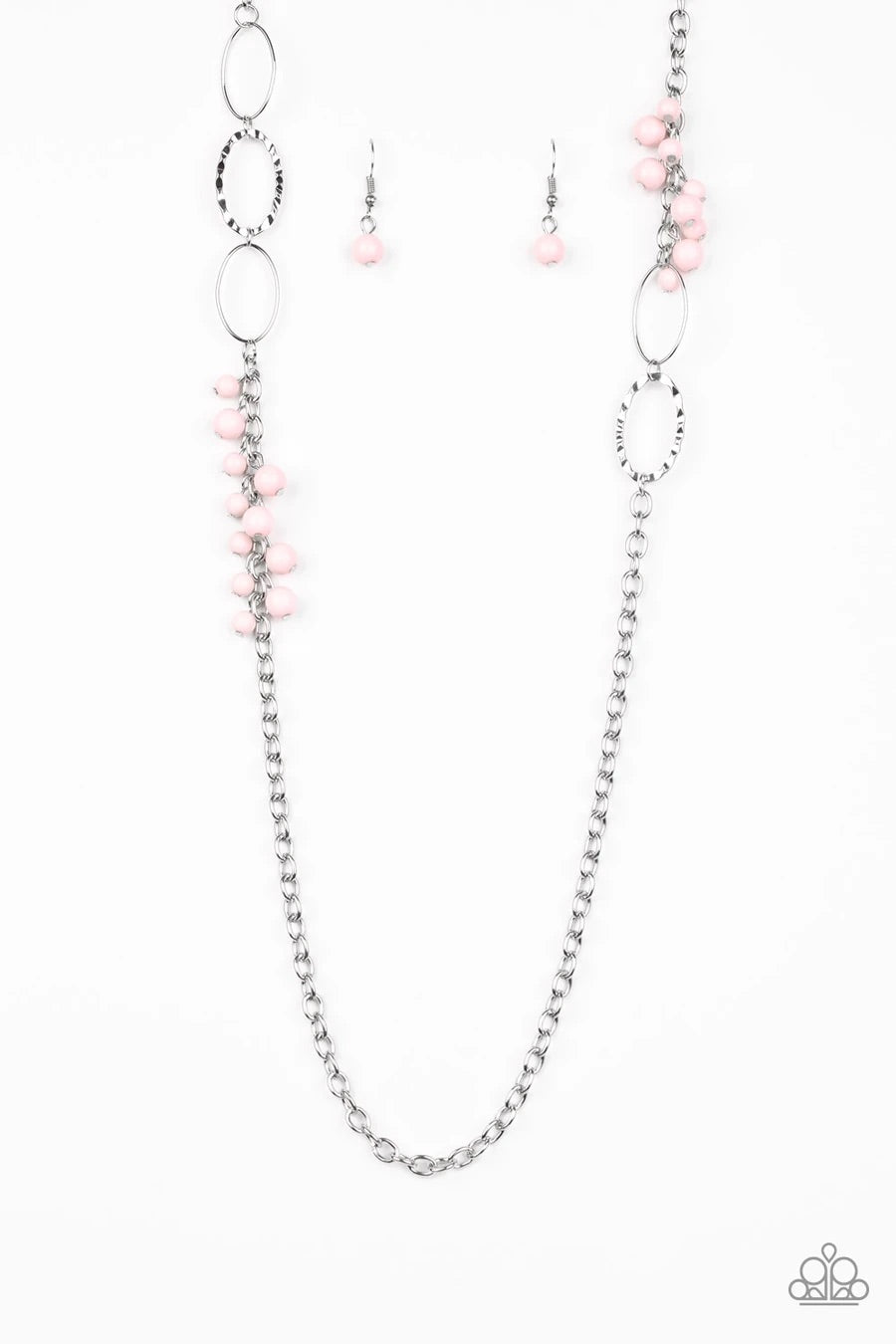 Smooth and hammered silver rings join clusters of shiny pink beads along a shimmery silver chain for a colorful look. Features an adjustable clasp closure.