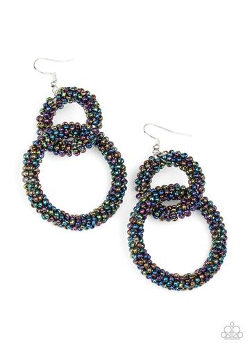 A dainty collection of iridescent oil spill seed beads adorns two interlocking hoops, creating a colorfully stacked lure. Earring attaches to a standard fishhook fitting.