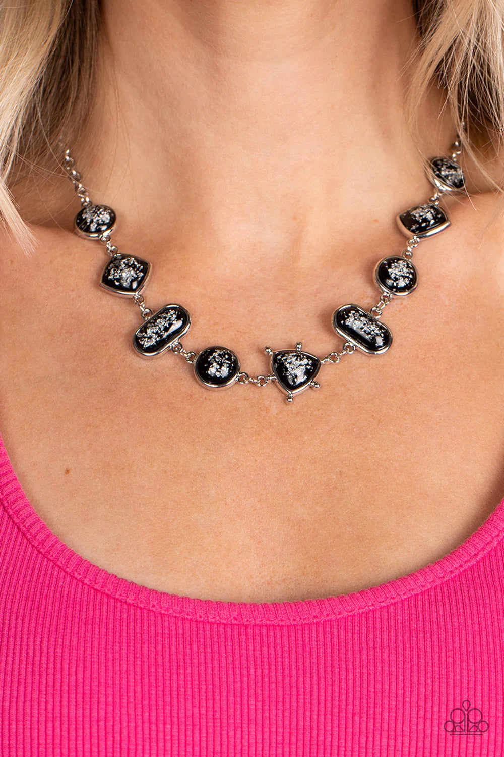 Glassy black beads speckled in flecks of silver shimmer delicately hang from a silver clasped chain, linking into a glitzy geometric pattern along the collar. Features an adjustable clasp closure.