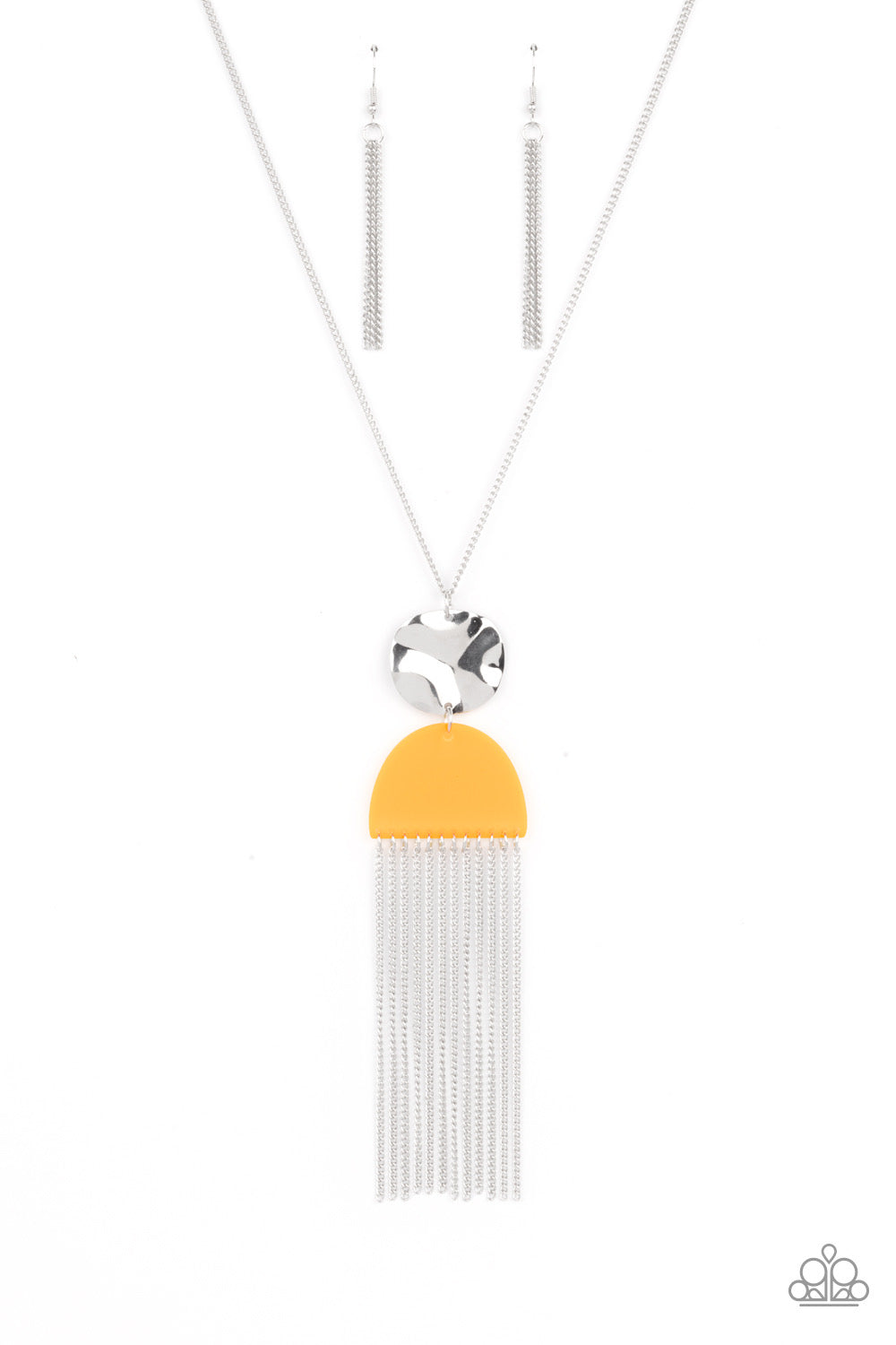 A hammered silver disc connects to a neon orange half moon acrylic frame at the bottom of a lengthened silver chain. A curtain of shimmery chains stream from the bottom of the stacked pendant, adding flirtatious movement to the colorful display. Features an adjustable clasp closure.
