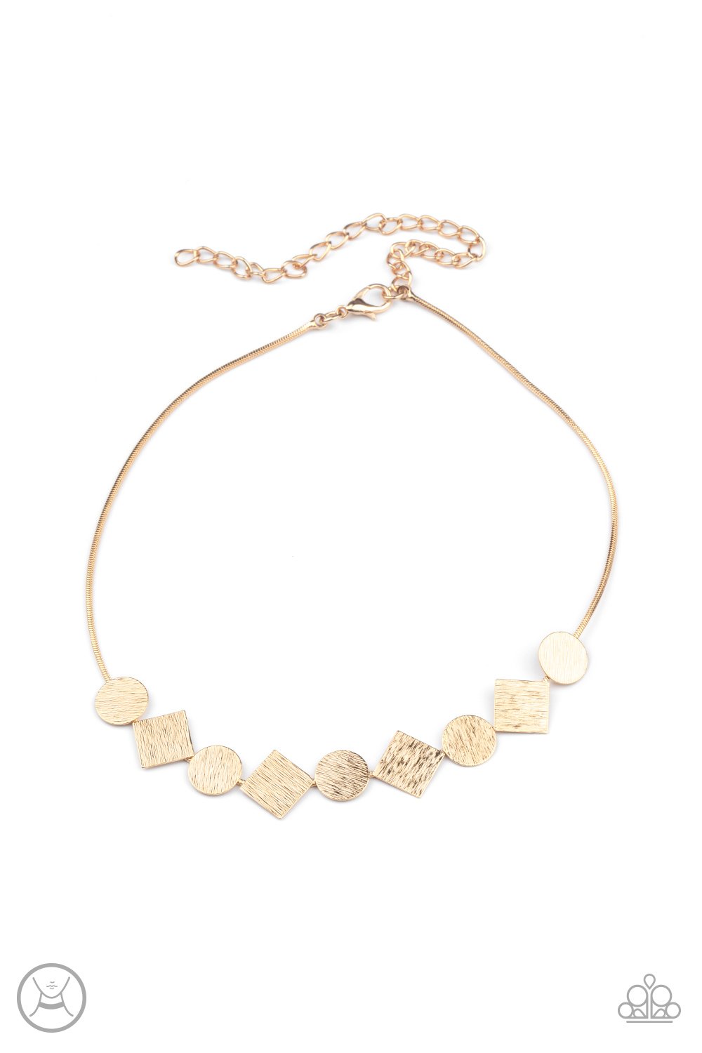 Gold Choker Necklaces featuring shimmery scratched surfaces, a dainty collection of flat round and square gold frames adorn the front of a gold snake chain around the neck for a minimalist inspired look. Features an adjustable clasp closure.