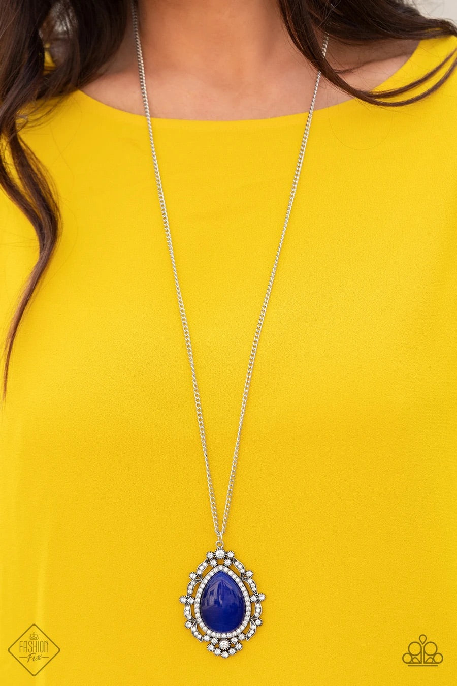 Dotted in glittery white rhinestones, leafy silver frames nestle around a glowing Classic Blue cat's eye teardrop center, creating a regal pendant at the bottom of a lengthened silver chain. Features an adjustable clasp closure.
