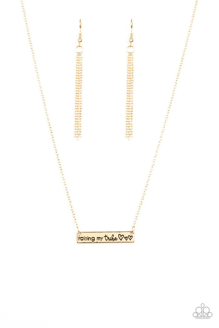 A shimmery gold frame stamped with the phrase, "raising my tribe", is suspended horizontally below the collar for a one-of-a-kind fashion. Features an adjustable clasp closure.