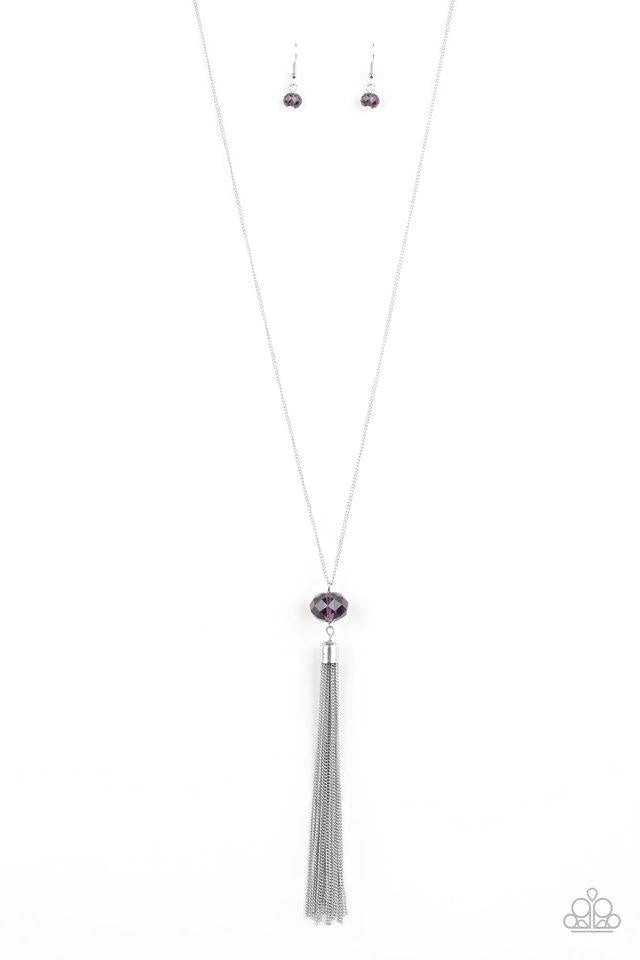 A glittery purple crystal-like bead swings from the bottom of a lengthened silver chain, giving way to a shimmering silver tassel for a glamorous finish. Features an adjustable clasp closure.